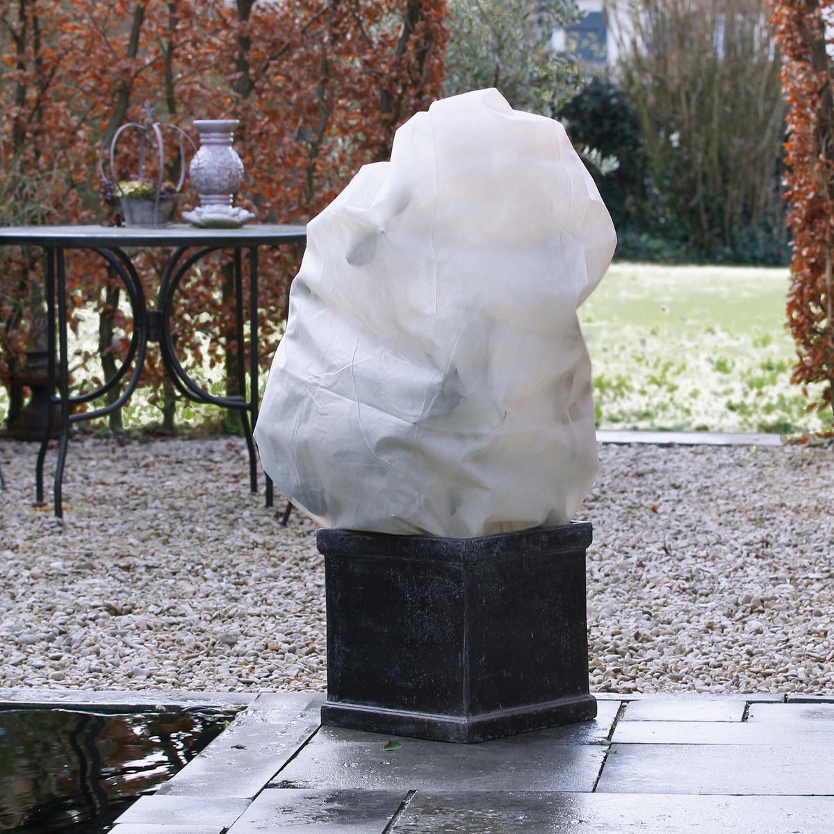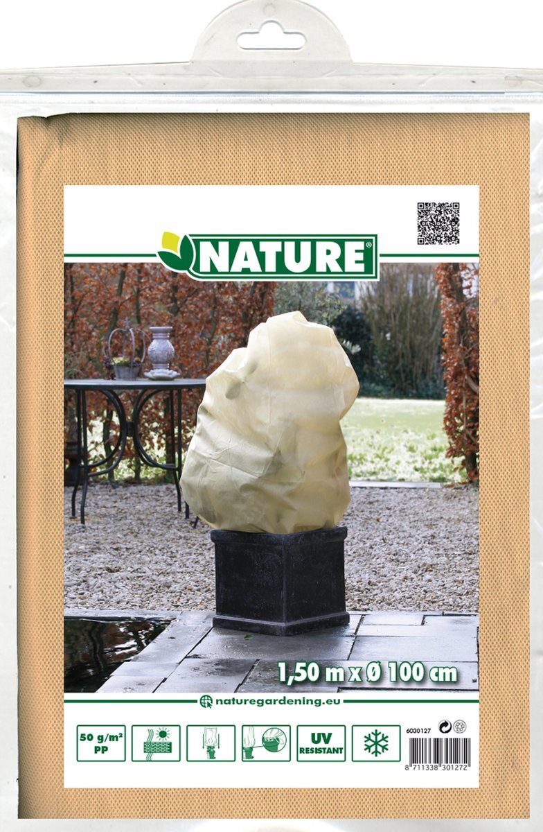 Afdekhoes van vliesdoek gemaakt van beige, UV-bestendig, niet-geweven polypropyleen en heeft een dichtheid van 50g/m². De hoes is voorzien van een koord aan de onderzijde voor een snelle bevestiging en, indien strakgetrokken, voor een betere isolatie. Geschikt voor het beschermen van (mediterrane) planten en struiken tegen lage temperaturen (lichte vorst). Het vliesdoek laat goed water en lucht door, wat betekent dat de plant kan ademen. Dit voorkomt verstikking van de plant. Afmeting: Ø 100 cm x 150 cm x 157 cm.