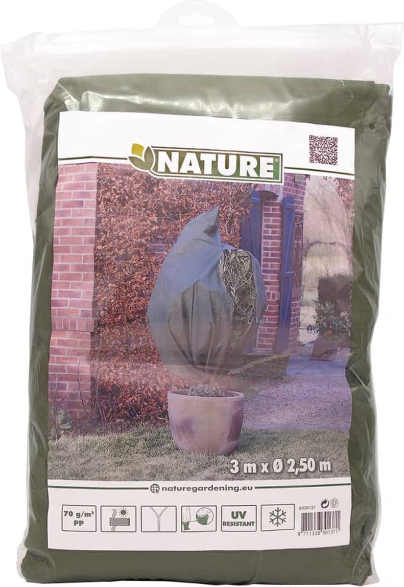 Afdekhoes van vliesdoek gemaakt van groen, UV-bestendig, niet-geweven polypropyleen en een dichtheid van 70 g/m². De hoes is voorzien van een ritssluiting en een koord aan de onderzijde voor een snelle bevestiging en, indien strakgetrokken, voor een betere isolatie. De ritssluiting maakt het mogelijk de plant snel te verzorgen, te luchten of water te geven. Geschikt voor het beschermen van (mediterrane) planten en struiken tegen lage temperaturen (lichte vorst). Het vliesdoek laat goed water en lucht door, wat betekent dat de plant kan ademen. Dit voorkomt verstikking van de plant. Afmeting: Ø 250 cm x H3 m x 3,93 m.