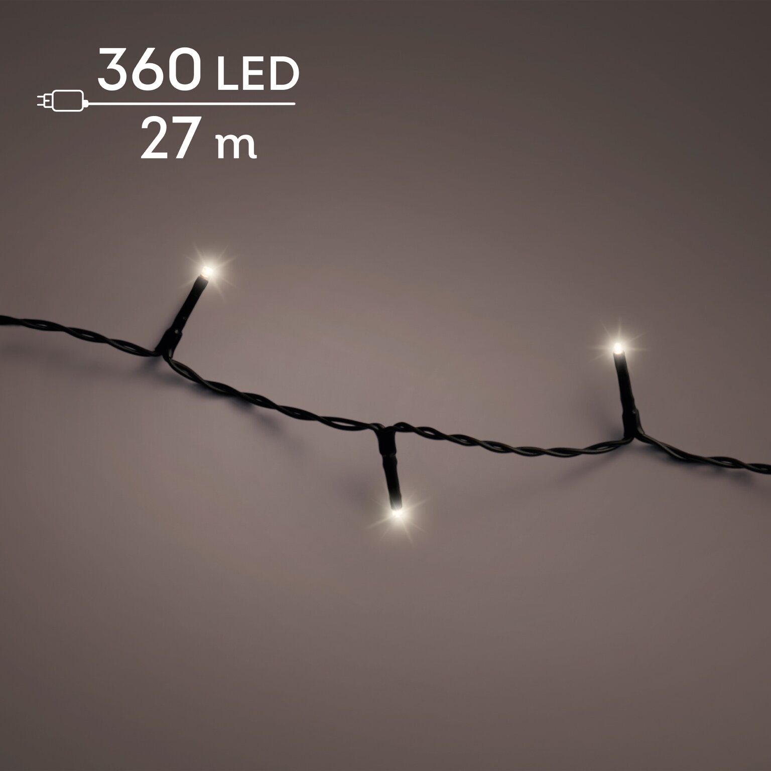 Met dit lichtsnoer breng je in één keer een warme, uitnodigende sfeer rond elke buiten boom, gevel of balkon. De 360 subtiele warm wit LED-lichtjes verdeeld over 27 meter zorgen voor een volledige en gelijkmatige verlichting. Dankzij de zwarte kabel valt het snoer nauwelijks op tussen takken of hekwerk, waardoor alleen het sfeervolle licht zichtbaar is. De verlichting is dimbaar, zodat je de lichtsterkte precies kunt afstemmen op het moment: van een intieme winteravond tot een levendig tuinfeest. De ingebouwde timer schakelt het lichtsnoer na 8 uur automatisch uit, comfortabel én energiezuinig. Door het lange aansluitsnoer plaats je het lichtsnoer eenvoudig, ook wanneer het stopcontact niet direct in de buurt zit.