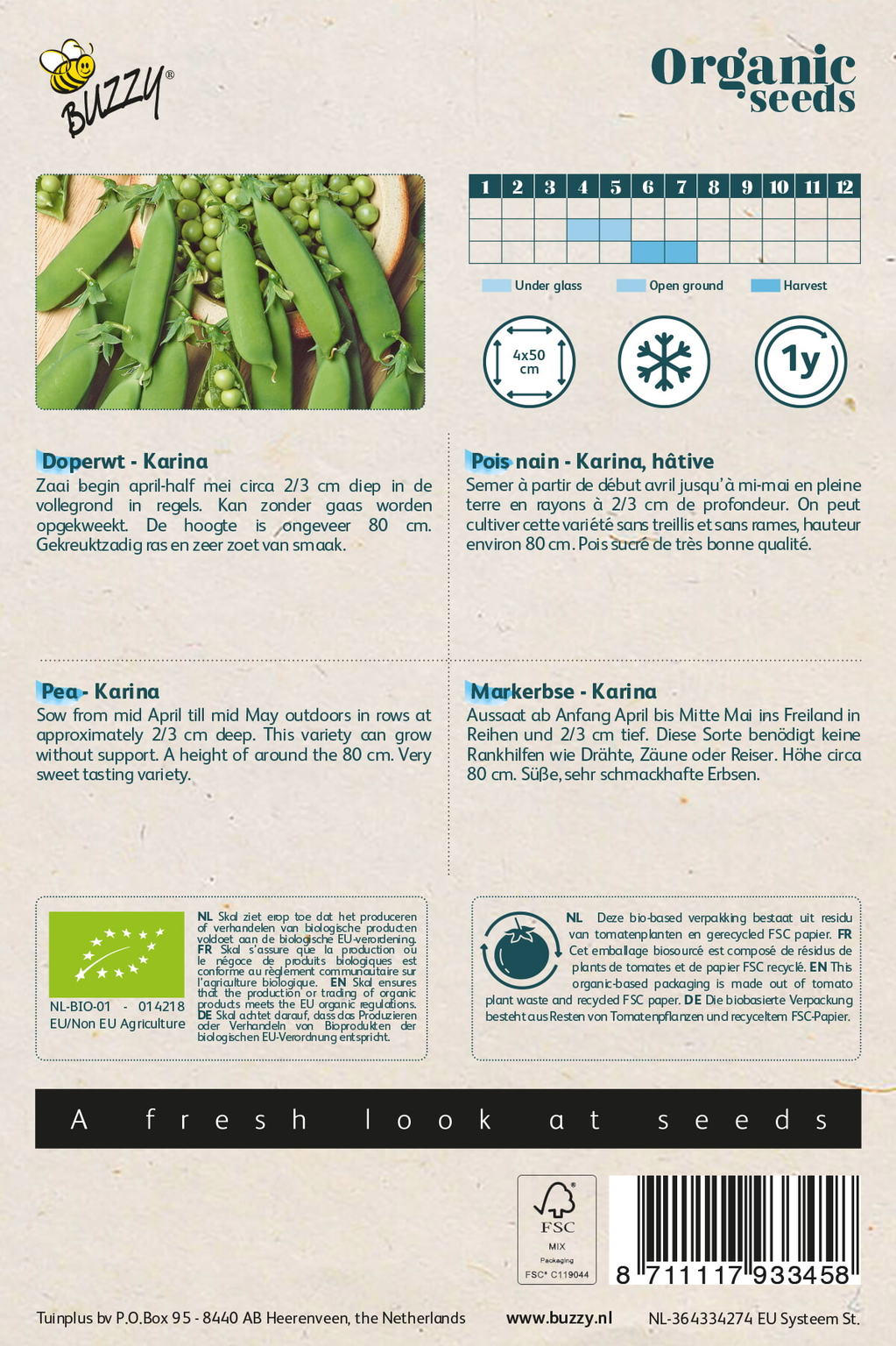 Zaai begin april-half mei circa 2/3 cm diep in de vollegrond in regels. Kan zonder gaas worden opgekweekt. De hoogte is ongeveer 40 cm. Gekreuktzadig ras en zeer zoet van smaak.